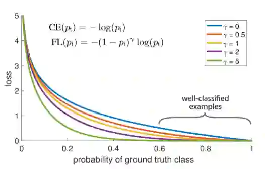 焦点损失旨在解决单阶段目标检测问题,因为图像中可能存在大量的背景类和几个前景类,这会导致训练效率低下。大多数位置都是容易产生任何有用信号的负片,大量这些负样本使训练不堪重负,降低了模型性能。焦力损失基于如下所示的交叉熵损耗,通过调整γ参数,可以从分类良好的样本中减少损失贡献。
