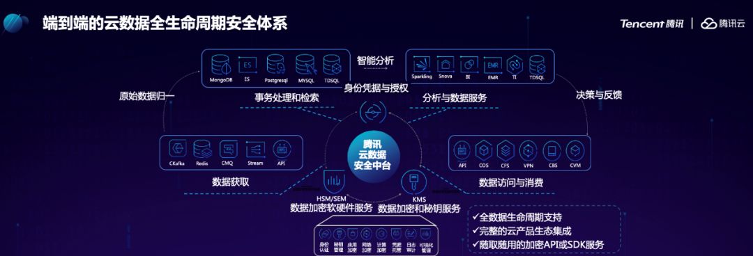 腾讯云打造了企业数据安全解决方案,在向企业客户提供服务时,充分发挥了腾讯过去20年积累的技术、人才、经验等优势,可以让企业极简快速地构建全生命周期的安全防护体系。腾讯企业数据安全解决方案通过与云上数据库系统,文件存储系统,大数据系统内核级深度对接,实现“按服务收费,一键开通”的同时,大大提升了防护范围和效果。提供审计,脱敏,加密,访问控制,数据资产发现等一系列功能,满足用户从等保合规,数据治理,综合防护,统一管控与管理咨询等各种需求。为用户提供“0”部署成本,“360度”数据保护的云原生数据安全解决方案。