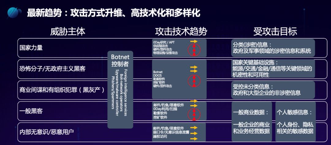 来自商业间谍和有组织犯罪“黑灰产”、恐怖分子以及国家层面的信息对抗呈现出显著上升趋势,带来了大量新的攻击技术和目标。据美国政府DNI(Director of National Intelligence)报告分析,具备发动信息战攻击能力的国家达到近40个。