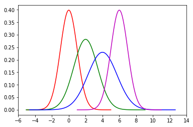 令均值μ=[0,2,4,6],方差σ2=[1,2,3,1],则4个高斯分布的概率密度函数的图形如下。