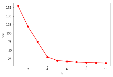 而当类别数到达真实类别数的临界点后,SSE开始缓慢下降,也就是说SSE和K的关系曲线一个肘部形状,这个肘部所对应的K值可以认为是合适的类别数。