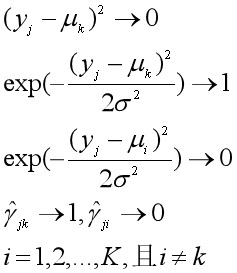 考虑σ2→0时的极限情况,如果样本yj属于第k类的概率最大,那么该样本与第k类的中心点的距离非常近,(yj - μk)2将会趋于0,于是有: