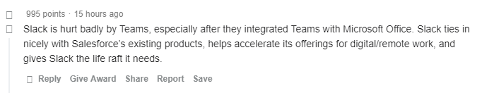 Slack被微软Teams伤得很重,尤其是在微软将Teams与Office整合之后。Slack与Salesforce现有的产品可以有机地结合在一起,这有助于加速Salesforce数字远程工作的产品的布局,同时也给Slack提供了它急需的救生筏。