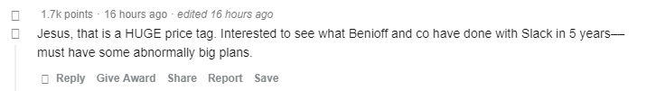 天啊,价格标的真的非常高了。我倒是想看看贝尼奥夫和他的团队在5年内要对Slack做什——他们一定在下一盘大棋。