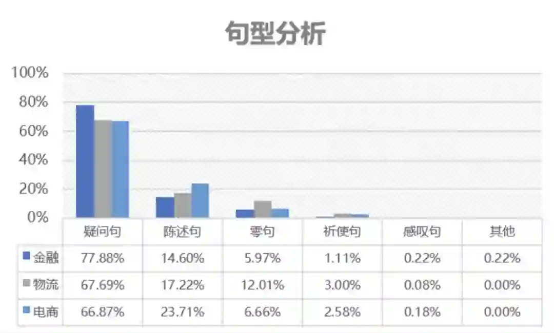 1.从句型来看,用户日志以疑问句为主。在不同行业中,用户问的疑问句型都占到了60%以上的比例。