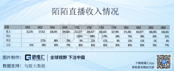 在18Q4,直播业务的收入达到4.3亿美元,同比增长31%,环比增长6%,占了陌陌总收入的77%,最巅峰的时候直播业务的占比达到85%。
