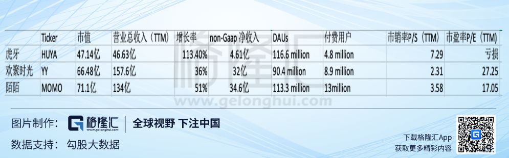 对比在美国上市的其他直播平台,对比同为秀场直播的YY,陌陌不管是营收增长率和盈利能力都比YY强,但是市盈率却比YY低。对比游戏直播平台虎牙,虎牙的增长性更好,但盈利能力还有待观察,所以出现虎牙的市销率比陌陌高。
