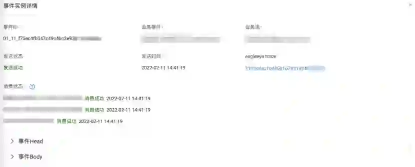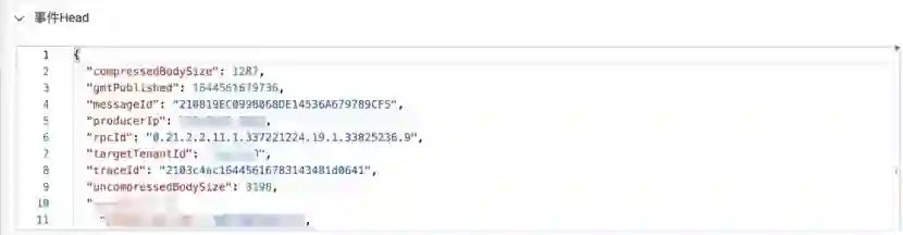 2. 事件Head:包含事件元信息,如trace信息、发送者信息、事件大小、MetaQ信息等,参考示例: