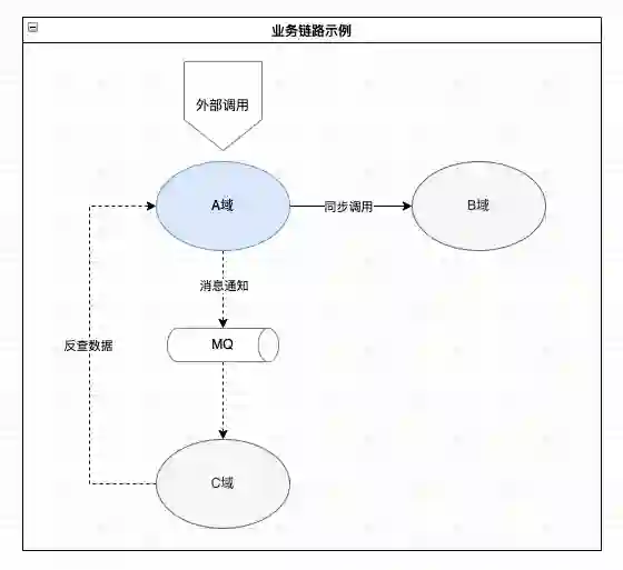 上图是一个典型的业务架构,A域是上游域,B域和C域是下游域。A域在收到外部调用请求时,首先同步调用B域的服务接口完成同步业务逻辑,然后发送消息通知到MQ。C域异步消费消息后,反向调用A域的接口查询详细信息,完成异步业务逻辑。