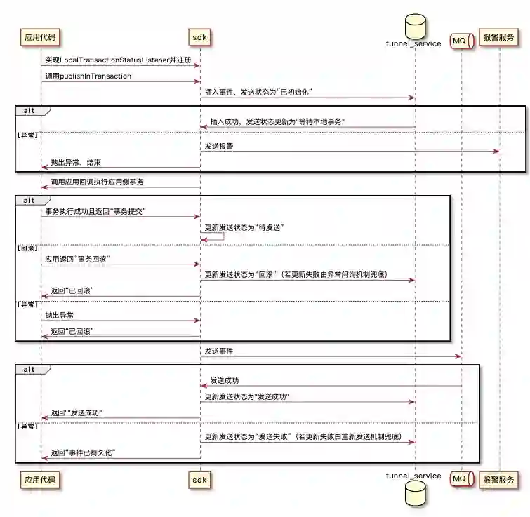 事件中心支持事务发送和非事务发送两种模式,使用状态机驱动,API设计与MetaQ的API基本一致。以下以事务发送为例介绍发送流程,由于非事务发送的流程更简单,所以不再详细介绍。
