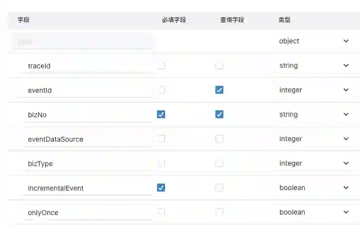 用户在修改事件定义时,可以为其中任意基础类型字段配置为“查询字段”,事件中心会在运行时解析该字段的值,并创建索引;一个事件中的每个查询字段都会对应一条索引;即使没有配置查询字段,也会生成一条包含时间戳的索引,用于已发送事件的排序和分页。