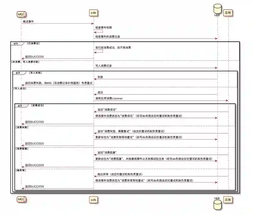 3. 事件消费者接收到事件后,相应修改自身的业务状态,并按需发出新的事件;消费者需要保证所有事件最终消费成功,否则会导致业务流程不完整;