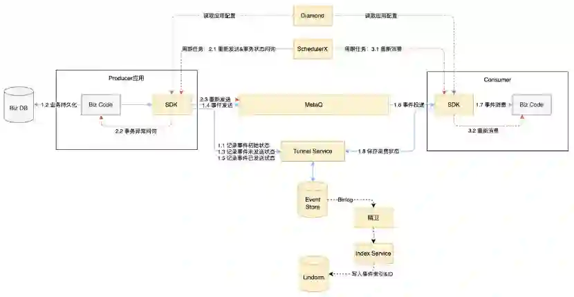4. 支持长期的事件历史查询、事件索引查询(如单据编号、sku)、事件重投;