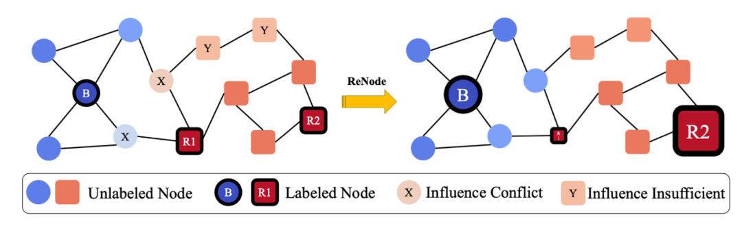 Message-Passing 是学习节点分类任务的最为重要而常见的方法,即标注节点沿着图中边将信息传递给无标注节点来进性节点表示学习。而 拓扑结构的不均匀就会导致信息传递中存在信息冲突(靠近类边界的节点)以及信息不足(远离信息源的节点)的问题,从而影响图模型训练(如图 1 左侧所示)。