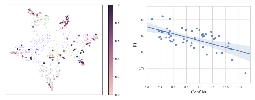 在图 3(左)中,我们展示了 t-SNE 降维的图节点在二维上的分布(不同颜色代表不同的类别,五角星的颜色深浅代表其 Totoro 值的大小),可以看出越是远离边界的标注节点 Totoro 值越小,而越是靠近边界的标注节点的 Totoro 值越大。