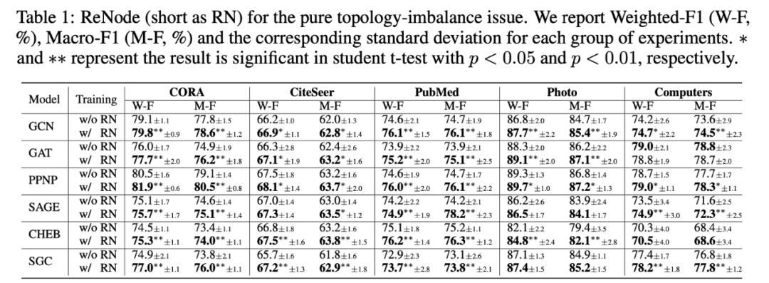 这里选用了 GCN, GAT, PPNP, GRAPHSAGE, Cheb GCN, SGC 等六个常用的图神经网络作为 backbone 模型,对比了是否使用 ReNode 方法情况下模型训练效果;在 CORA 等 5 个 benchmark 数据集上,ReNode 方法能够有效地缓解拓扑不均衡问题并提升模型的训练效果。
