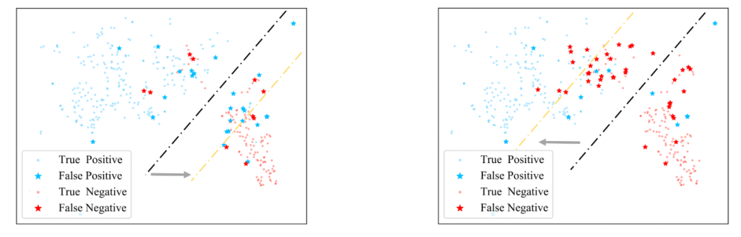 在图 2 中我们展示了图中两种不同的不均衡问题:1)左图是在随机采样的情况下,图中同时存在数量不均衡和拓扑不均衡的问题,模型的决策边界(黄线)向少数类偏移;2)右图是在类别数量均匀采样的情况下,图中依然存在拓扑不均衡的问题,此时模型的决策边界向多数类偏移。