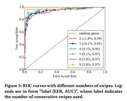 图5显示了ROC曲线,通过改变划分的次数来进行分类决策。增加滑动次数时,分类错误可以大大减少。随着我们将滑动次数增加到8次,EER本地收敛到3.0%。尽管数据集的有限大小不允许我们进一步增加滑动次数,但结果清楚地表明使用多次滑动可以提高准确性。