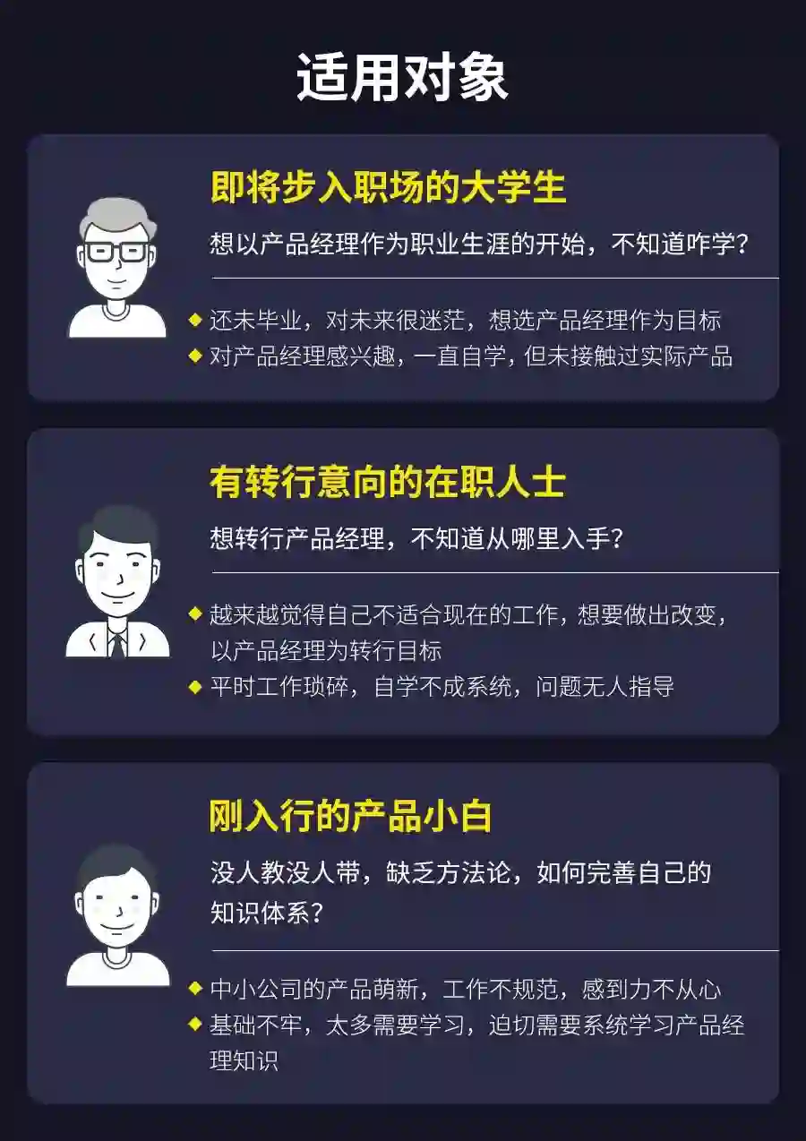 产品经理就业特训营10周高强度学习让你告别产品小白,系统化锻造产品思维,从0到1完整建立互联网产品经理知识体系。