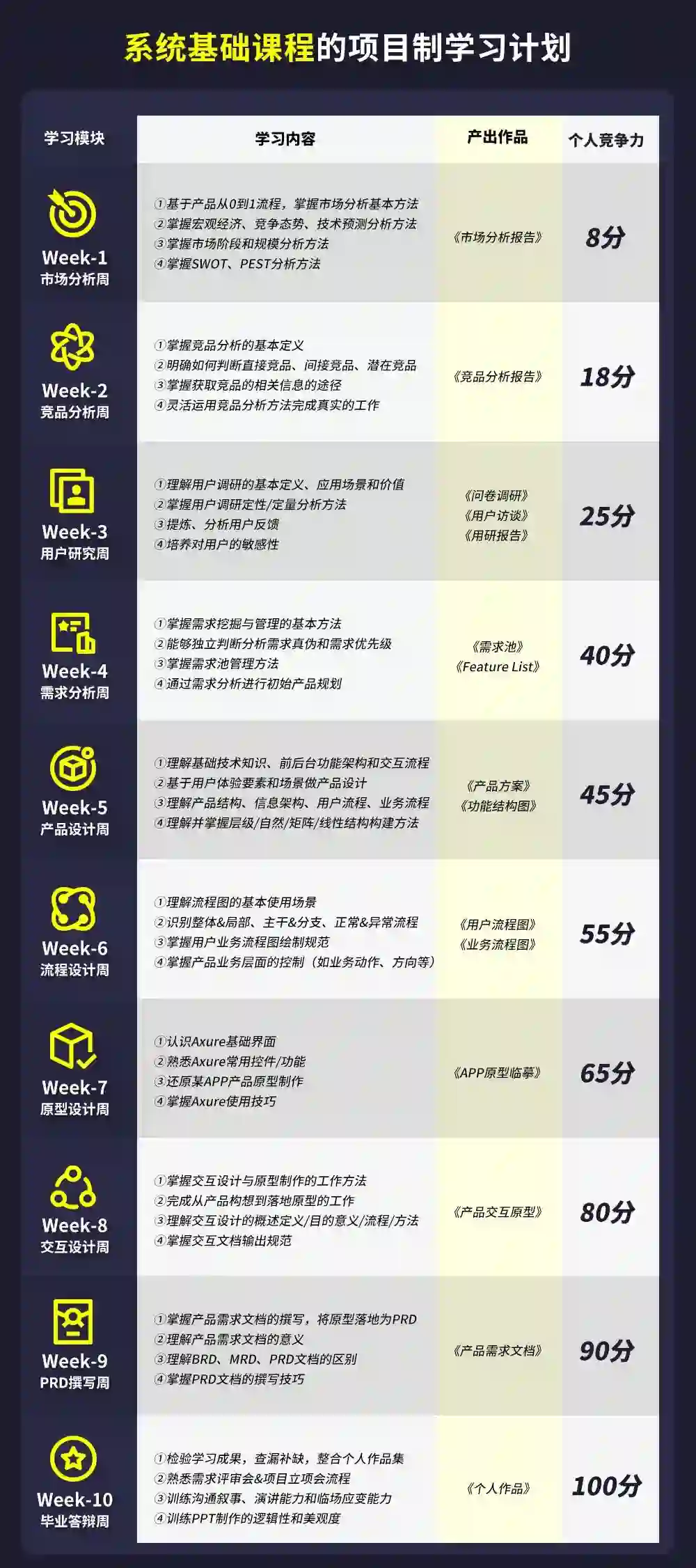 学习内容源自BAT产品培养体系和企业招聘需求,一款产品从诞生idea→调研分析→设计落地,10周高强度学习,帮你快速掌握产品经理必备的理论知识,思维方式,工作工具等。