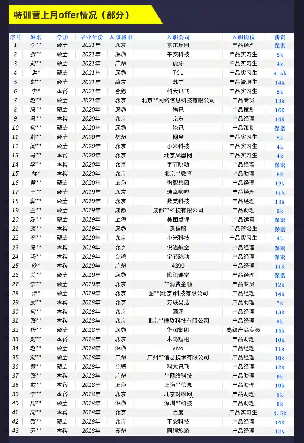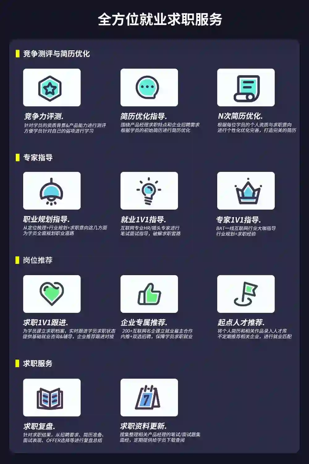 11项求职就业服务与合作企业资源网。学习的最终目的是成为企业需要的产品人才,成功就业。业内其他产品课程,听完课就“戛然而止”了,导致很多学员依旧不懂这些问题: