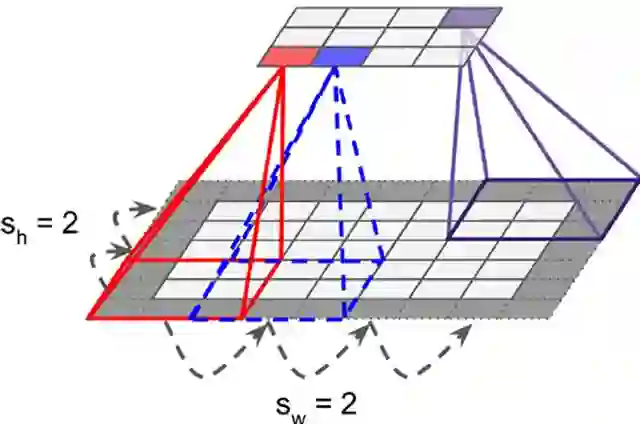 有时扫描时不是顺序去扫,而是跳跃着扫描,每次移动2-3个像素值(stride),但并非完全分离不会造成信息丢失,这样形成的feature map相较于原始图片缩小,实现信息聚集的效果。