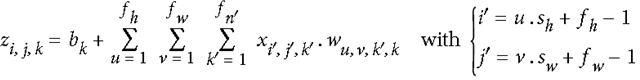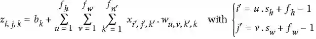 如下图,可以代表i行j列k深度的一个输出像素值,k’代表第k个filter,w代表filter中的值,x代表输入,b是偏值。