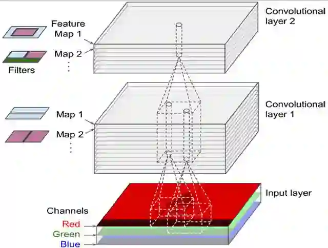可以模拟局部感受眼的性质,同上一层不是全连接,而是一小块区域连接,这一小块就是局部感受眼(receptive field)。并且通过构造特定的卷积神经元,可以模拟不同神经元对不同形状刺激不同反应的性质。如下图所示,一个神经元处理一层会形成一个feature map,多层叠加,层数逐渐加深。