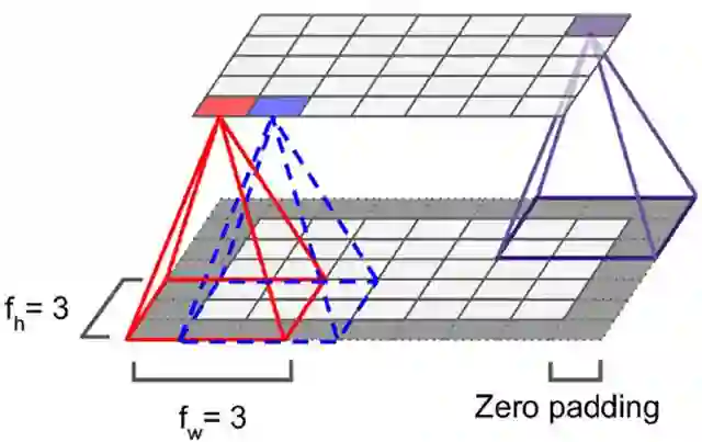 感受眼(kernel或filter)的尺寸可以看做fh*fw,由于感受眼本身具有尺寸,feature map会不断缩小,为了处理方便,使得每层大小不变,于是我们每层加值为0的边(zero padding),保证经过处理以后的feature map同前一层尺寸一样。多层之间的卷积运算操作,相当于和原来像素对应位置做乘法。如下左图所示,加了边后可以保证上下层大小一致,右图表示每层之间convolve的操作(如果不加zero padding)。