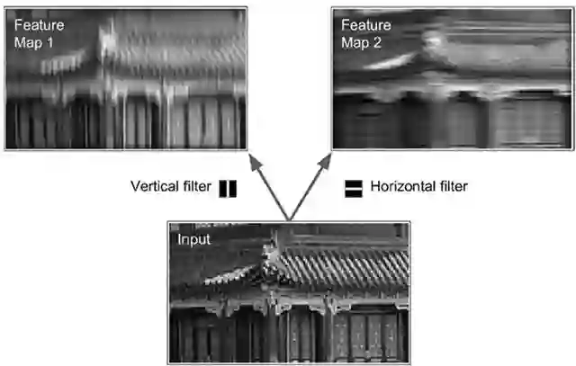 就像如下灰度图(2d)中所示,左边只提取竖线(vertical filter),右边只提取横线(horizontal filter)可看出横梁部分变亮,大量不同的这样的filter(比如可以识别边角、折线的filter)的叠加,可形成多张feature maps