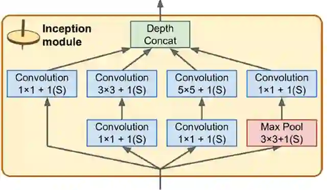 如右图所示,输入是192,使用了9层inception module,如果直接用3*3,5*5参数,可以算一下,之后inception参数数目是非常大的,深度上可以调节,可以指定任意数目的feature map,通过增加深度把维度减下来。inception模块6个参数刚好对应这6个convolution,上面4个参数对应上面4个convolution,加入max pool不会改变feature map数目(如480=128+192+96+64)。