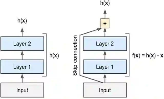 不再直接学习一个目标函数,输入直接跳过中间层直接连到输出上,要学习的是残差f(x),输入跳过中间层直接加到输出上。