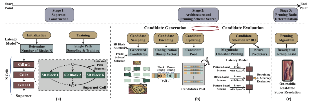 框架示意图:(a)超级网络构建;(b)编译器感知的结构和剪枝搜索;(c)编译器感知的压缩倍率的搜索