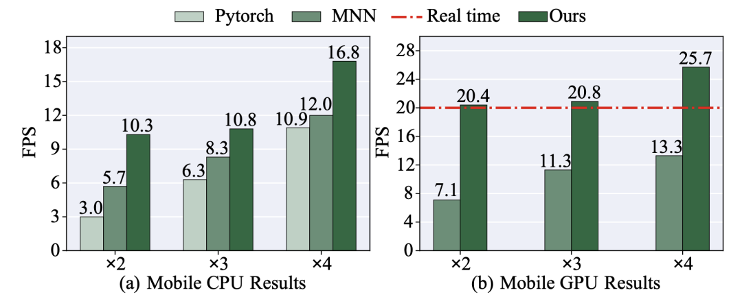 该套框架率先实现了在移动端(三星Galaxy S20)部署720p实时超清(每帧仅需数十毫秒),并保证了高图像品质。