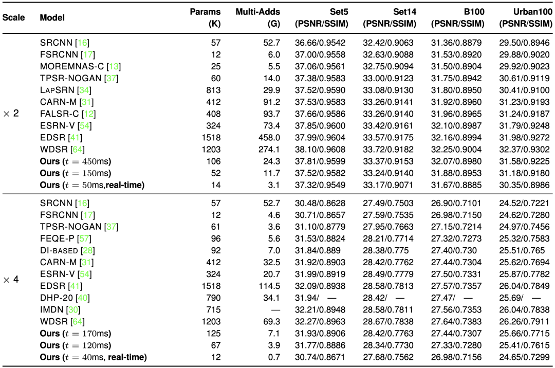 由于实时运行通常需要至少20帧/秒,本文对x2升采样任务采用t为50毫秒,x4升采样任务采用t=40毫秒来获得满足实时推理需求的模型。