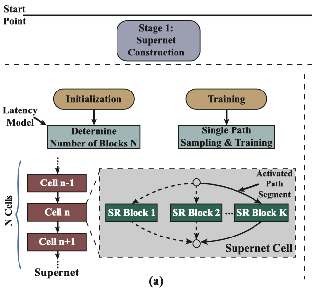 每个超级网络单元块中的超清模块选取定义为一个路径段,所有N个路径段的可能组合形成了架构搜索空间A,A的大小为KN。N个路径段构成了一条路径,即一个超清候选模型。在对超级网络训练的过程中,只有一条路径被激活,而其他未被选择的路径则不参与训练。