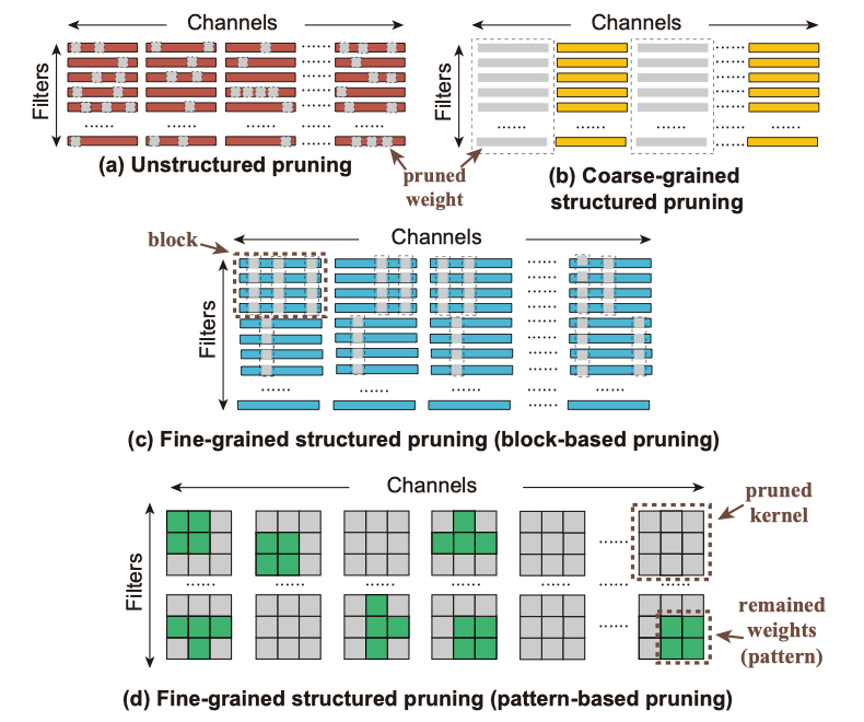 (a)非结构化的权重剪枝;(b)粗粒度的结构化权重剪枝;(c)细粒度的结构化权重剪枝-基于块;(d)细粒度的结构化权重剪枝-基于模式