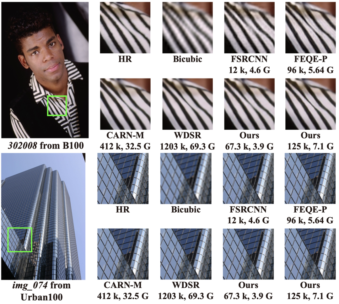 对于x4升采样任务,本文以t=120毫秒获得的模型比SRCNN、FSRCNN、以及FEQE-P性能更佳。当目标延迟t=170毫秒时,本文获得的模型比DI和CARN-M具备更佳的PSNR/SSIM表现,同时需要相似甚至更少的累加累积操作数。此外,当t=40毫秒时,本文获得的模型在保持不错的PSNR/SSIM表现的同时,满足了实施推理的需求。