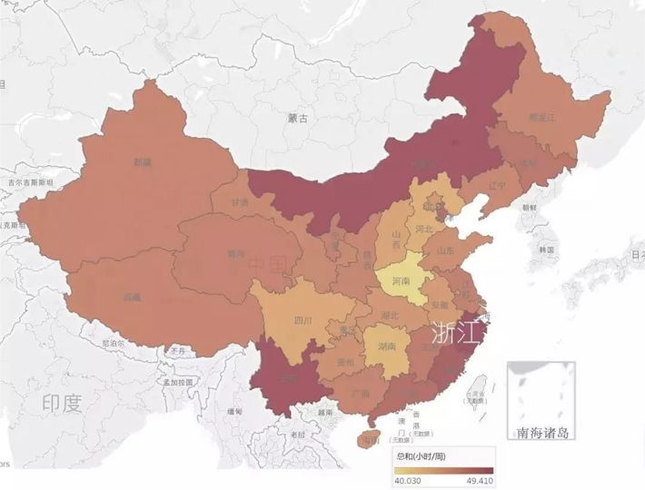 浙江一周工作时间最长,估计是为来满足全国人民不分昼夜的买买买,浙江密集的商户就不停的卖卖卖吧。