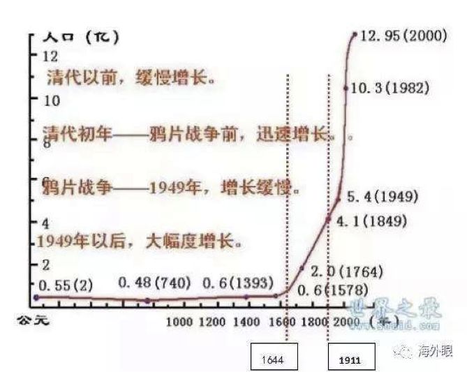1644年清朝人口激增,主要历史原因:1644年康熙时期,改革农业税按人头征税转由按地亩征税,这就是著名的“摊丁入亩”。自然就不需要少报人头来偷税漏税。