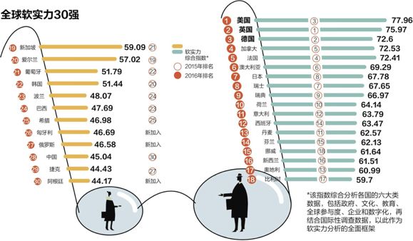 从图中可以看出书:美英德始终雄踞TOP3,中国排名28,中国经济的腾飞,拉开了经济与文化的差距,中国文化提升国际影响力的路还很远。加油我的国。