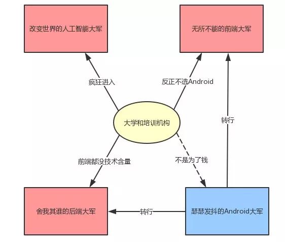 虽然现在Android的就业形势不大好,但是其他技术领域的就业趋势也不乐观,这是因为现在高校和培训机构大量的培养人员涌入。我05年上大学时,软件工程专业不是很火爆,学一些常规的技术,比如算法与数据结构、C++程序设计、面向对象方法及程序设计等等,毕业了也就是搞搞C++,做做Java Web和.NET等等。而放眼现在,IT相关的专业简直就是火爆,大家都觉得这行有发展赚钱多,因此越来越多的学生报考了相关专业,很多大学都有移动互联应用技术专业,还有人工智能学院,每年都有大量的大学毕业生和培训机构出来的涌入市场,而中国的互联网企业显然不需要这么多的人才,最终的结果可想而知还是狼多肉少。