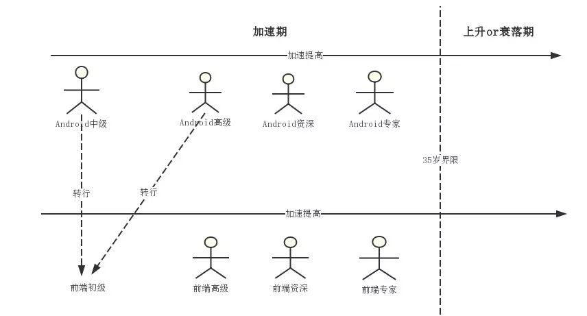 从图中可以看出,大部分人在35岁前是在加速期,35岁后是上升或者衰落期。以Android开发转前端来说,假设一个Android高级A同学转行前端会变为前端初级,这时从事前端的人都在加速提高,A同学要想赶超前面的拥有同样加速度的人是不可能办到的,这就导致他在转行前期极为被动,A同学还要保证在35岁前成为前端专家或者Leader才有可能在35岁后不进入衰落期,当然这时A同学的Android基本也就荒废了,很难成为专家。如果还想要在技术领域走的更远,就不要轻易的进行转行,如果想要转越早越好,越快越好,因为其他的竞争者都在加速提高,没人会停下等你的。