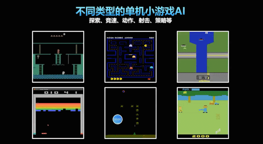 我们首先看看最简单的单机小游戏。大多数这种游戏都来自一个叫雅达利的外国公司,可以说是现代游戏主机的鼻祖。这类游戏有各种各样的类型,包括探索类、竞速类、动作类、射击类、策略类等等。不同的分类能够帮助AI学习不同的能力。