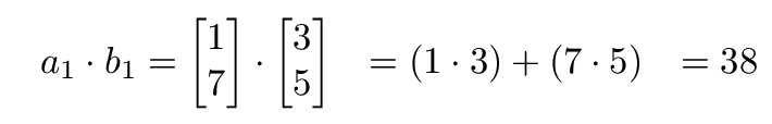 A 矩阵行向量 a1 与 B 矩阵列向量 b1 的点积,即下图所示: