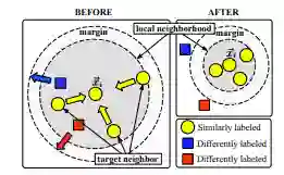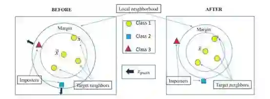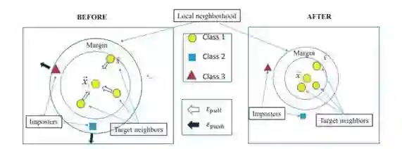 此外,在LMNN的基础上,又有人提出了基于密度加权的 LMNN 分类算法(DLMNNC):这是因为在将 LMNN 算法与 KNN 结合时由于 LMNN 算法的特点在很大程度上可能会增加样本密度分布不均匀,在应用于文本分类仍然会有较大的误差。