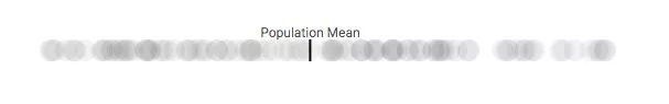 为了降低这个定理的理解门槛,首先我们来举个简单的例子。假设有一个包含100人的团体,他们在某些问题上的意见分布在0-100之间。如果以可视化的方式把他们的意见分数表示在水平轴上,我们可以得到下面这幅图:深色竖线表示所有人意见分数的平均值。