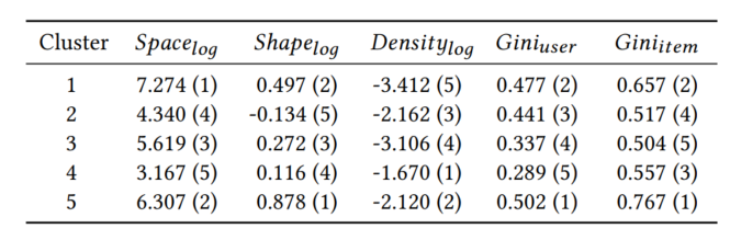 另外,作者还分析了数据集的结构特性(Structural Characteristics),主要反映在空间指标、形状指标以及稠密度指标上。通过下述公式可以看出空间指标反映了用户-物品矩阵空间的大小,形状指标反映了用户与物品的比例,稠密度指标则反映了观测数据相对于所有数据的比例。