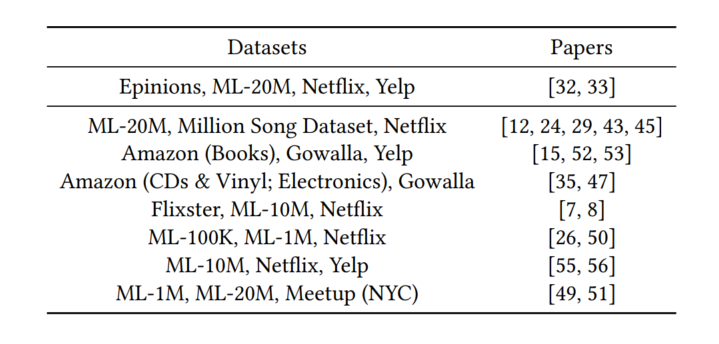 另外,通过利用Apriori算法来对这些论文可能结合的数据集模式进行分析发现,以下数据集组合经常在统一论文中出现,比如ML-20M与Netflix等。另外作者发现,尽管上述论文都解决了基于top-K推荐的隐式反馈问题,但分析表明,数据集的选择往往是任意决定的。即使两篇论文在同一数据集上进行了评价,由于数据预处理或分割策略不同,结果可能不具有可比性。