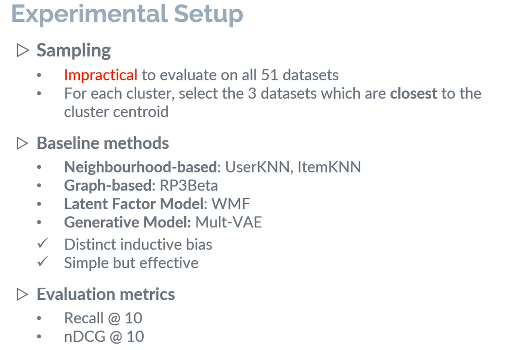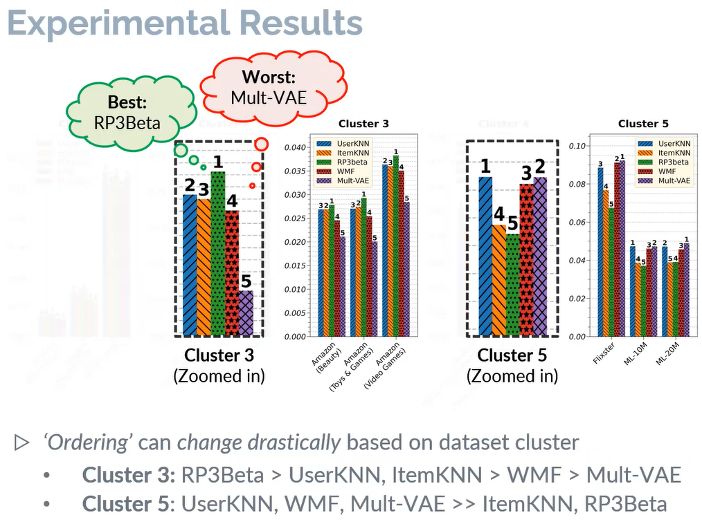 最后,作者选取了5个典型算法(UserKNN、ItemKNN、RP3Beta、WMF以及Mult-VAE)在上述不同的簇中选取了3个数据集进行测试,来探索在不同的簇中测试的推荐效果是否一致。